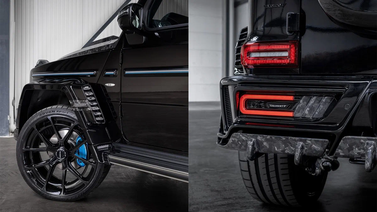 Судя по всему, для электромобиля адаптировали один из обвесов, ранее разработанных для бензиновых моделей, например, из линейки Mansory Gronos. Внедорожник лишился закрытой панели на месте традиционной решётки радиатора, получив вместо неё фирменный логотип и массивный передний бампер с диагональными ходовыми огнями. Капот дополнен характерными для Mansory воздуховодами.