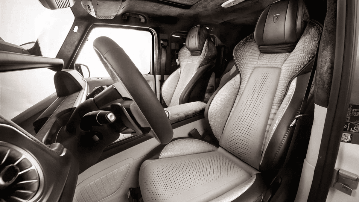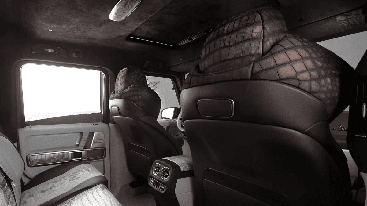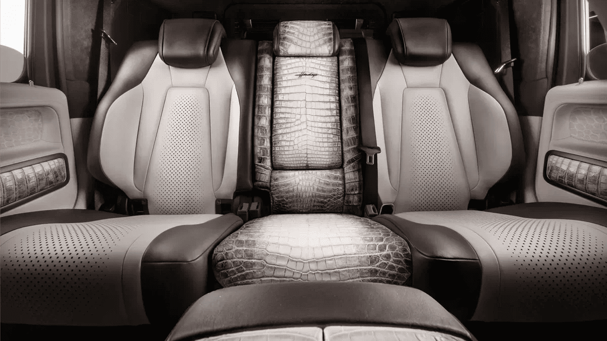Салон внедорожника не менее впечатляющ: его частично отделали кожей крокодила, выделанной по тем же строгим принципам, что и материалы для элитных аксессуаров (в качестве примера ателье приводит сумки Hermès). Кожа крокодила украшает боковины кресел и дверные панели, а остальные поверхности выполнены из других дорогостоящих видов кожи.