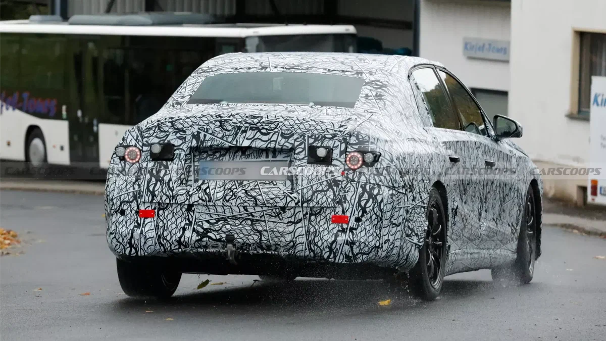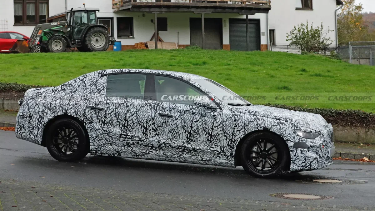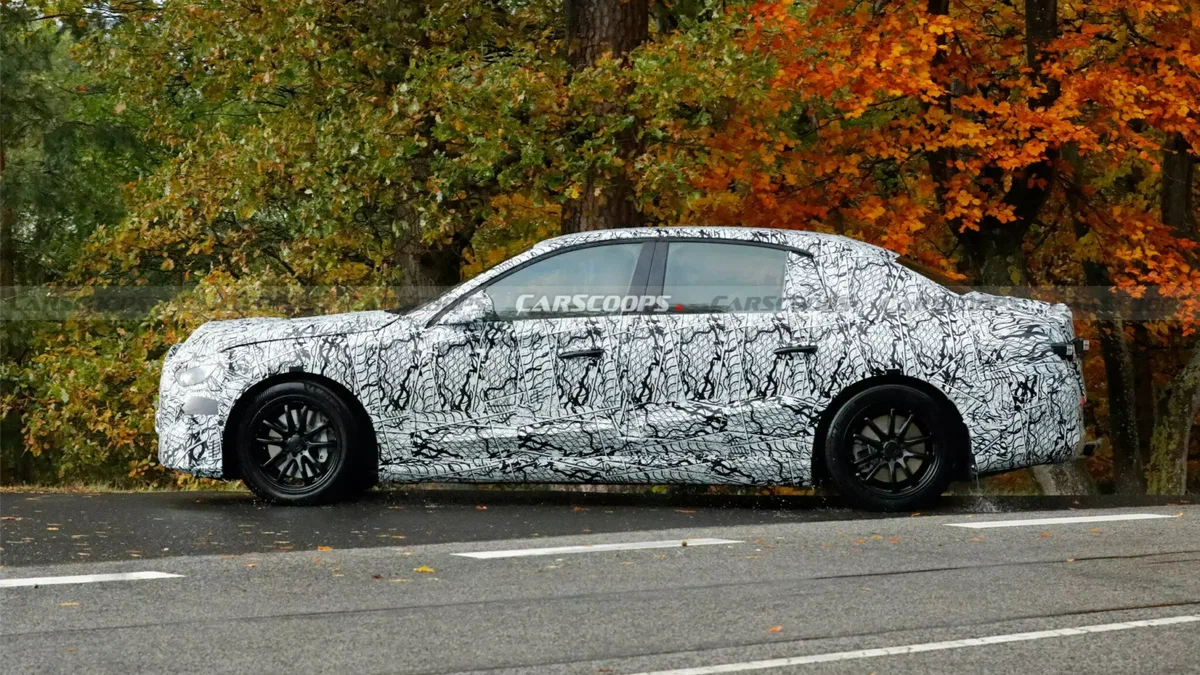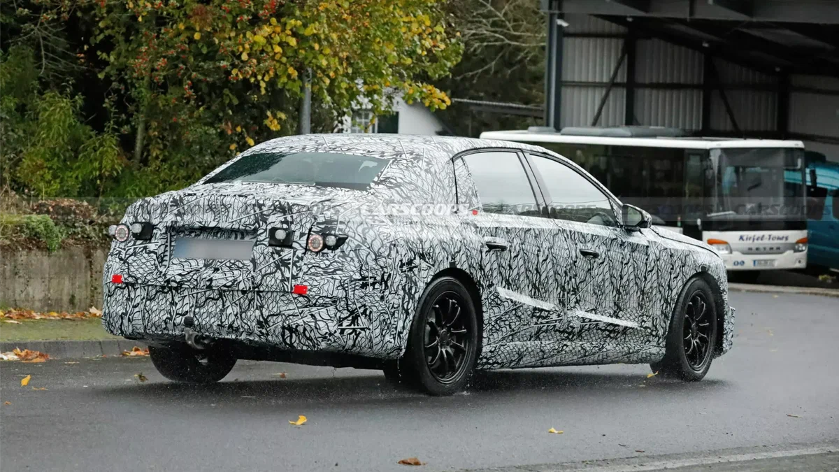 Внешне батарейный E‑класс отличается вытянутым силуэтом с плоским капотом и небольшим передним свесом. Конструкторы сделали багажник относительно коротким, но увеличили задний свес. На бортах заметны выштамповки, а дверные ручки сохранили классический формат. Пока большая часть деталей скрыта под маскировочными накладками — они закрывают светотехнику, боковое остекление и радиаторную решётку. Однако характерная выпуклость на капоте намекает, что седан может получить тот же дизайнерский элемент, который ранее дебютировал на GLC.