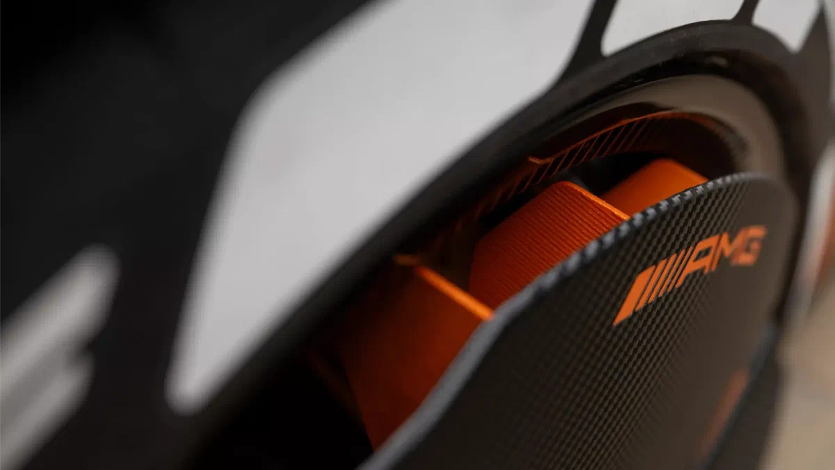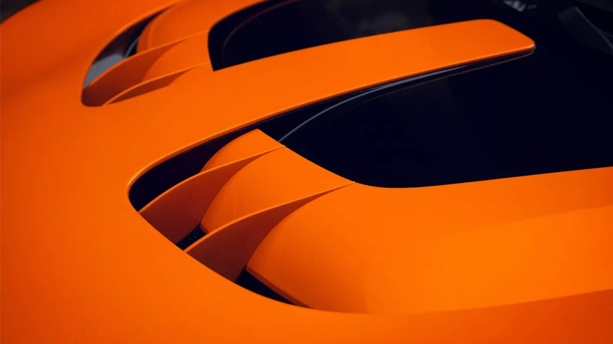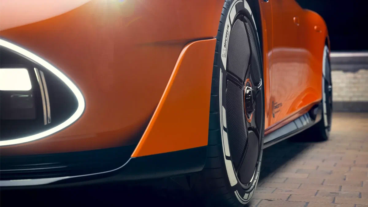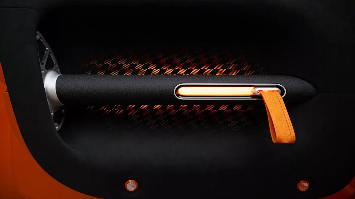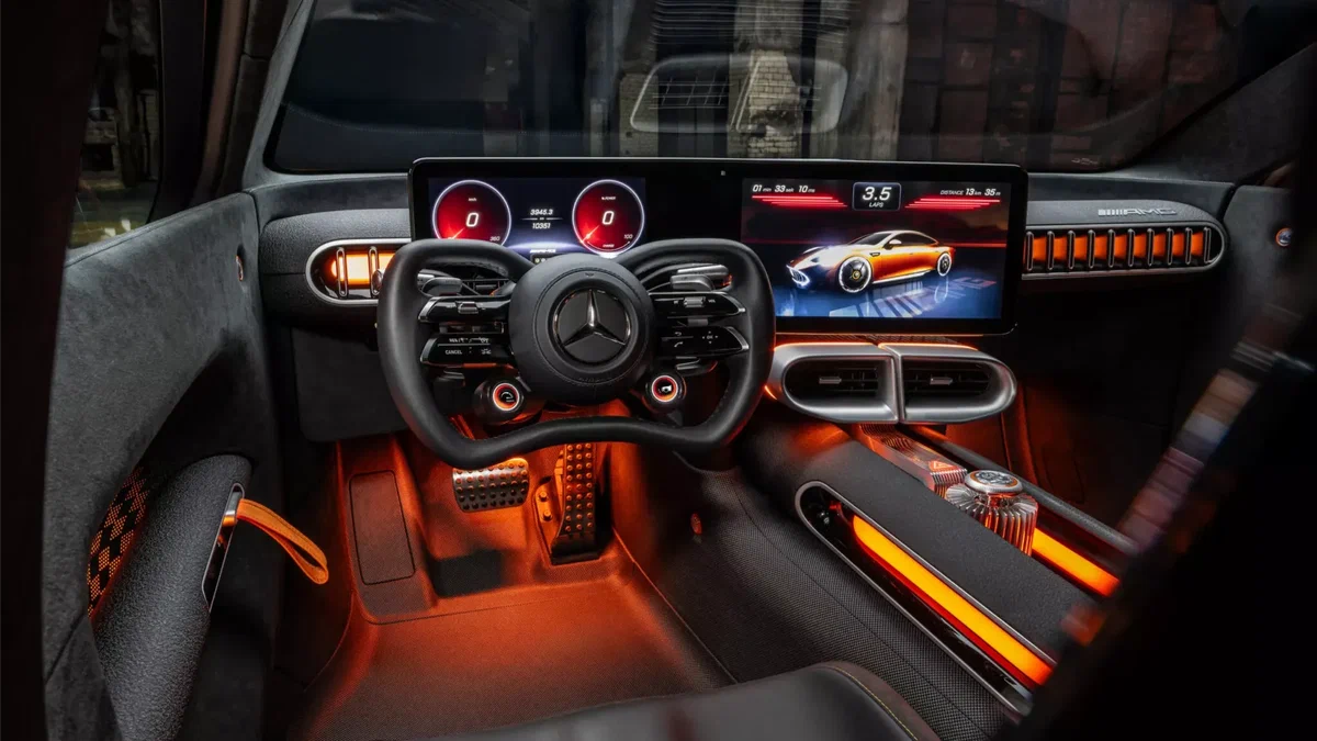 Интерьер сочетает карбоновые кресла с 3D-печатными сменными подушками, инновационную биокожу из переработанных гоночных шин и спортивный кокпит с рулём-штурвалом и двумя дисплеями (10,25 и 14 дюймов). Оранжевые ремни в дверях заменяют ручки, а подсветка центрального тоннеля напоминает высоковольтные кабели.