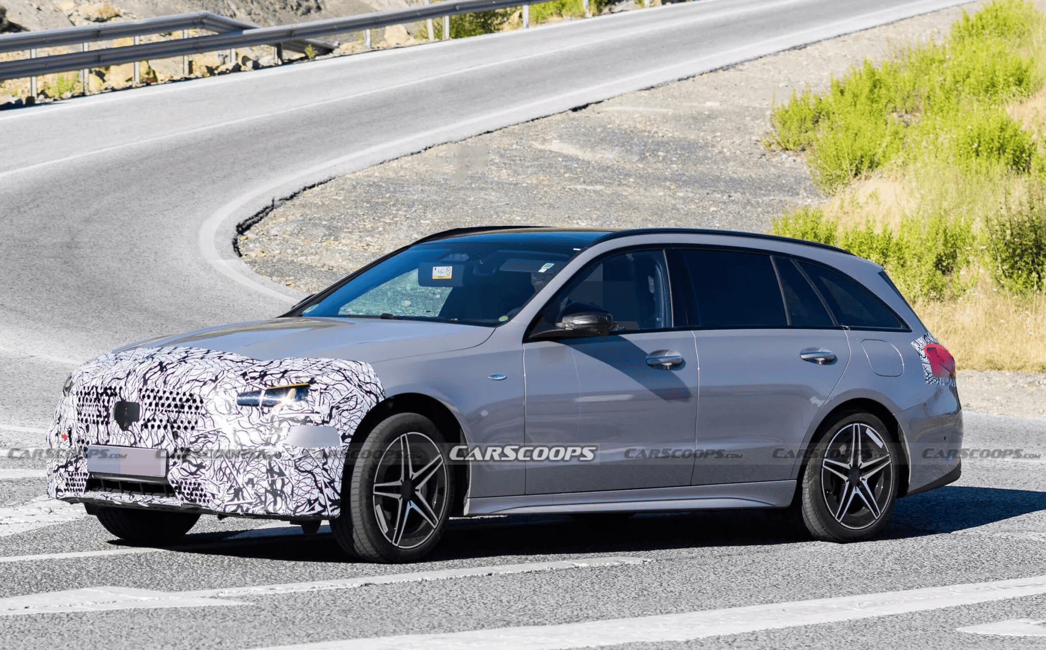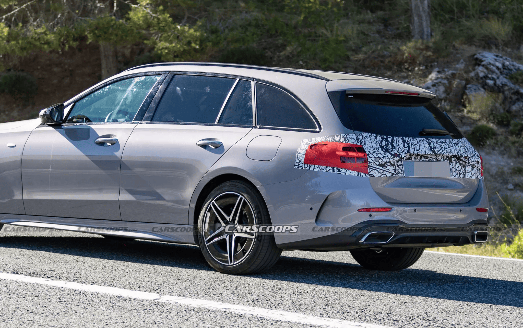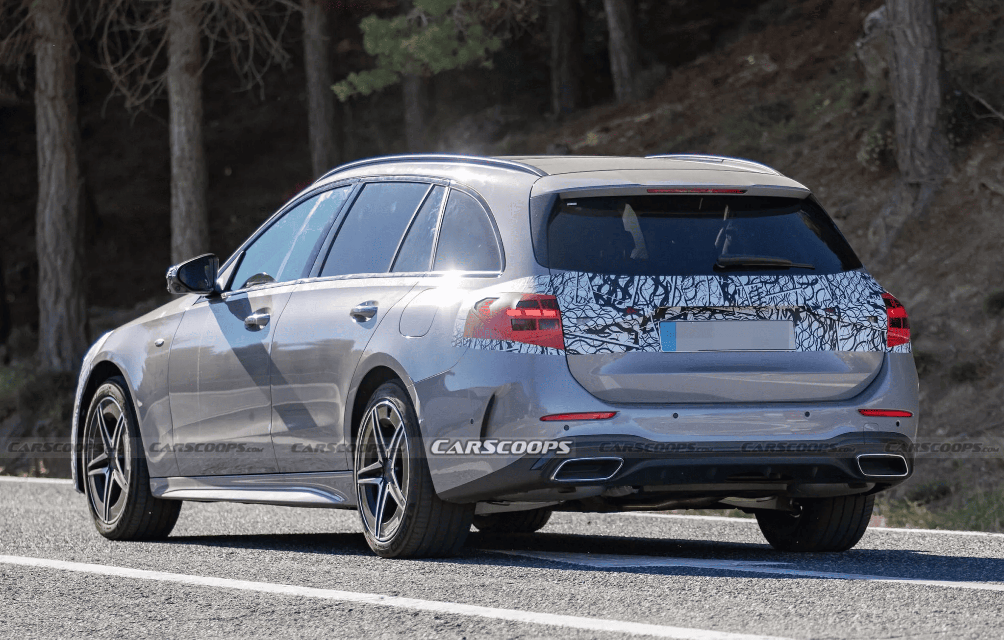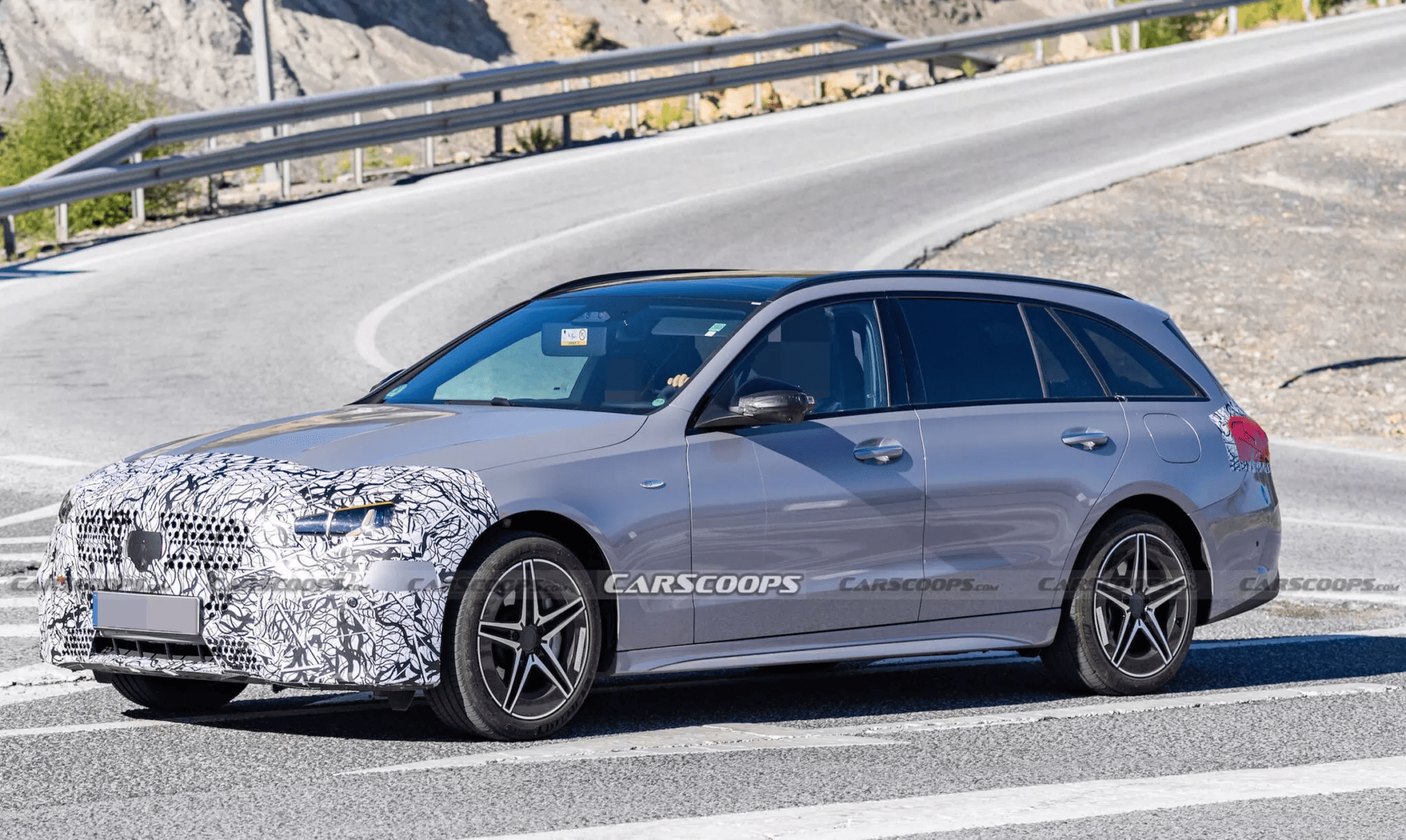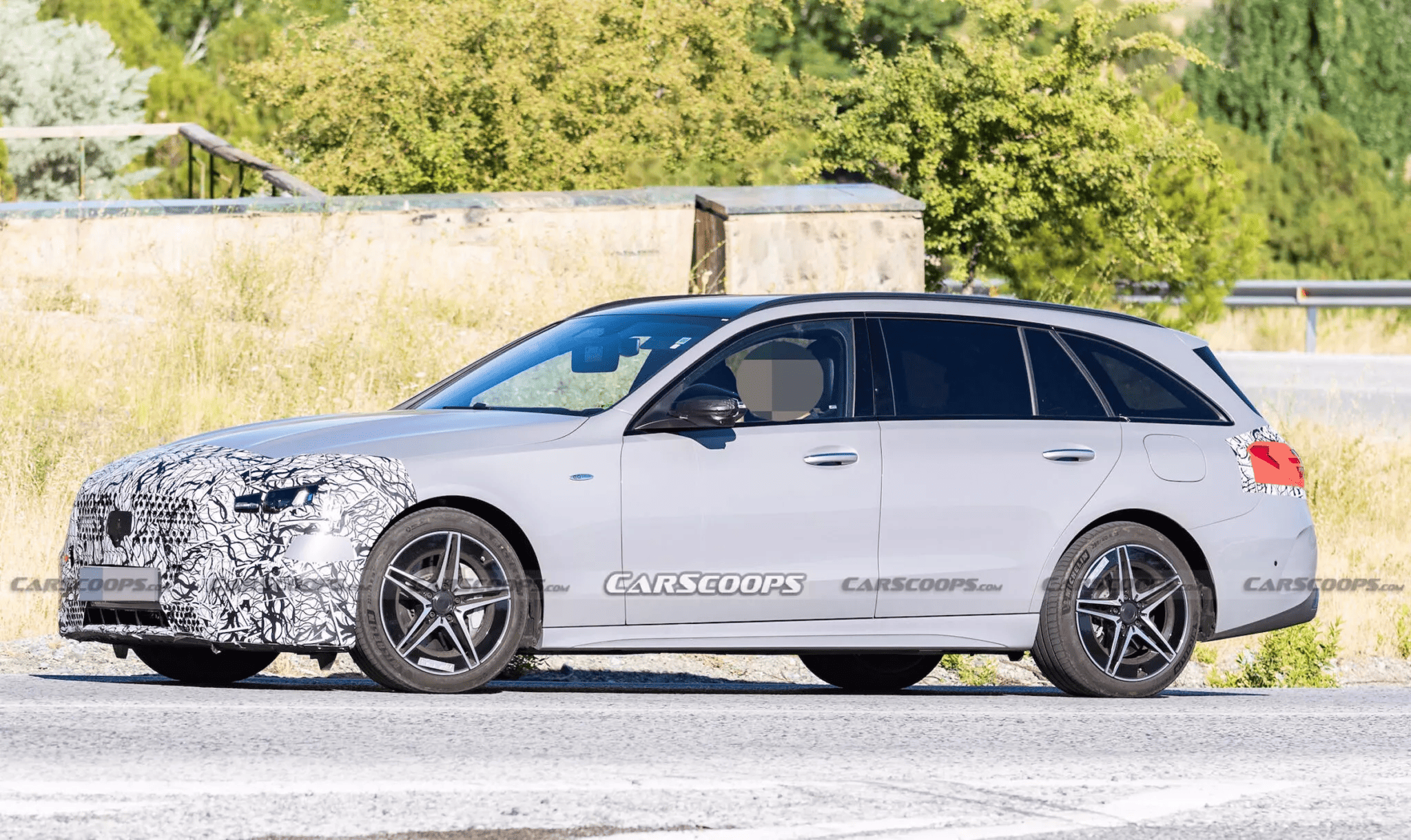 Снаружи изменения затрагивают фары, бамперы и решётку радиатора. Передние фары получили звёздочки в дневных ходовых огнях, которые Mercedes теперь ставит на всю линейку. Удивительно, но задние фары на этом универсале не имеют характерной «звёздной» графики — возможно, под камуфляжем скрыт обновлённый дизайн.