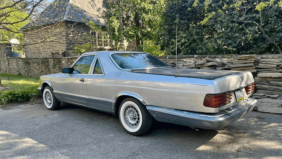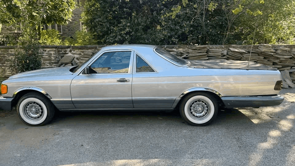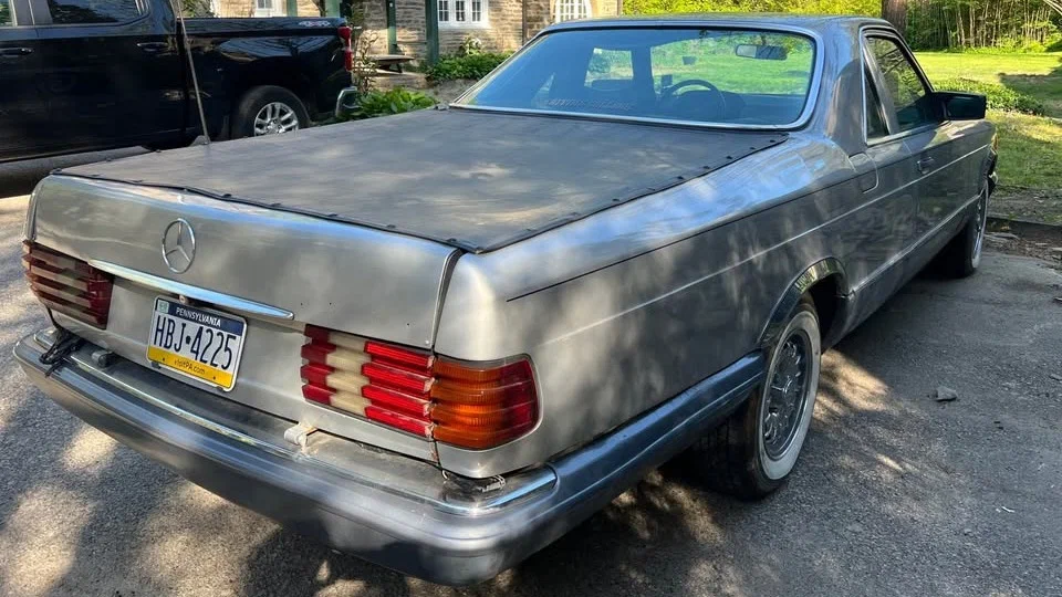 В Филадельфии (США) появился на продаже необычный кастомный автомобиль — Mercedes‑Benz W126, творчески переработанные в стилистике пикапа Chevrolet El Camino. За основу проекта взят S‑класс 1981 года с дизельным шестицилиндровым двигателем; при этом задняя часть кузова подверглась серьёзной трансформации: после передних дверей конструкторы создали покатую заднюю стенку, добавили небольшие треугольные окошки и заметно удлинили задний свес. Внешне машина прикрыта простым чехлом, который отчасти скрывает текущее состояние кузова.