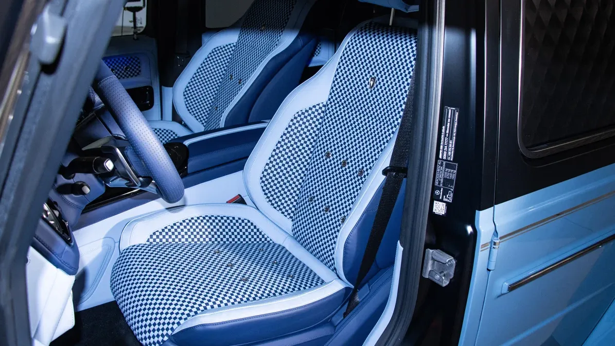 Внешне автомобиль выделяется синей окраской кузова, кастомными колёсными дисками, имитирующими классические колпаки, и специальным бодикитом, разработанным тюнерами. Хотя бамперы окрашены в цвет кузова, в отличие от типичных хромированных версий, хромированные элементы всё же присутствуют — они добавлены в виде акцентов, подчёркивающих премиальность образа. Особое внимание уделено салону: он полностью перешит высококачественной кожей наппа с сочетанием разных оттенков синего, а также декорирован стильными клетчатыми вставками, отсылающими к классическому британскому стилю. Грузовой отсек частично отделан экзотической древесиной — продавец не уточняет породу, но подчёркивает её редкость и благородный вид. Передние сиденья модифицированы — по фото видно, что они получили увеличенную боковую поддержку, что улучшает комфорт и фиксацию при движении.