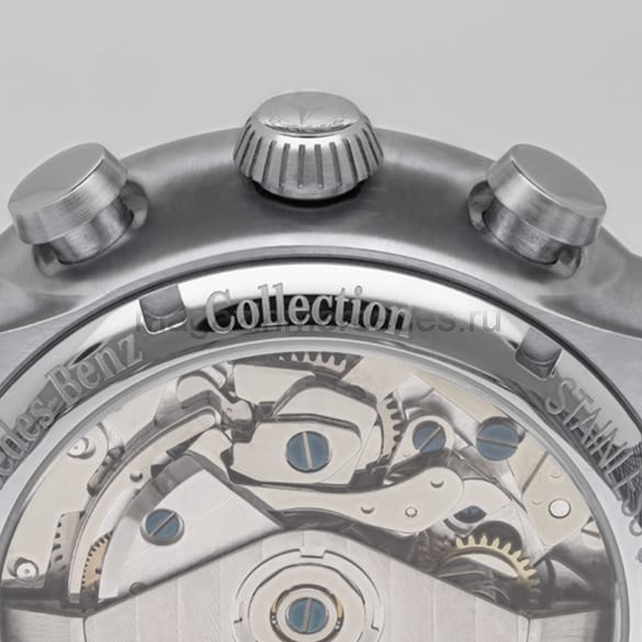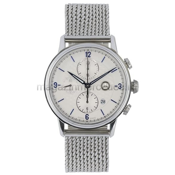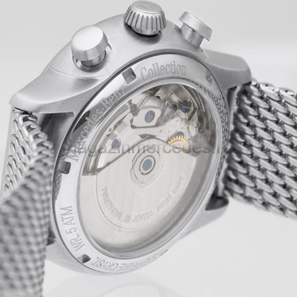 Автоматические часы-хронограф для мужчин в серебристом, нечисто белом и синем цветах можно носить во многих случаях благодаря его элегантному дизайну. Корпус из нержавеющей стали с полированной и матовой поверхностями образует рамку для выпуклого сапфирового стекла с антибликовым покрытием двух сторон, через которое белый циферблат с нанесенными метками и цифрами в синем цвете. Кроме того, задняя крышка из сапфирового стекла – прозрачная, и через нее видно швейцарский автоматический механизм Sellita SW500, который не только оснащен функцией секундомера, но также украшен воронеными часовыми винтами, узором «женевские полосы» и жемчужной шлифовкой. Помимо исторической звезды «Мерседес-Бенц» на отметке 09:00, на циферблате хронографа также есть индикатор даты, который находится на отметке 04:30. Вороненые стрелки с люминесцентным покрытием Super-LumiNova® позволяют даже в темноте легко считывать время, а высококачественный браслет миланского плетения с полированными и матовыми поверхностями и высококачественная застежка-бабочка обеспечивают надежное крепление на запястье.