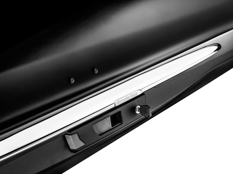 открывать с обеих сторон. Двусторонняя система с одним замком и тройным запиранием обеспечивает дополнительный комфорт. Максимально допустимая грузоподъемность: 75 кг. Высококачественные материалы, комфортная сдвижная система крепления: монтаж с помощью сдвижной системы под силу одному человеку. Высококачественные газовые пружины для легкого открытия и закрытия крышки. В комплекте три ремня для фиксации груза. Защищен от брызг воды, аэродинамичный и элегантный дизайн с трехмерной эмблемой бренда. Адаптирован к дизайну автомобилей «Мерседес-Бенц», эксклюзивен и доступен для приобретения только в «Мерседес-Бенц».