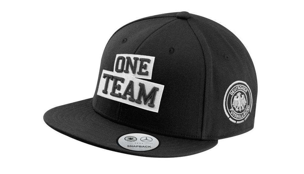 Идеальный головной убор и надежная защита от солнца в солнечную погоду: бейсболка с плоским козырьком из серии ONE TEAM из 100%-ного хлопка. Черная бейсболка с объемной вышитой надписью "ONE TEAM" впереди, вышитой звездой "Мерседес-Бенц" на правой стороне и вышитым логотипом Немецкого футбольного союза на левой стороне непременно привлечет внимание. Партнерский логотип "Мерседес-Бенц" и Немецкого футбольного союза серебристого цвета на козырьке и нижняя сторона козырька контрастного красного цвета идеально дополняют дизайн. Внутренняя подкладка с черной тесьмой с надписью "Мерседес-Бенц" и удобная застежка Snapback с биркой черно-красно-золотистого цвета обеспечивают приятный комфорт ношения.