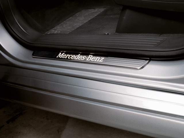 Для индивидуализации автомобиля мы предлагаем накладки на пороги из зачищенной нержавеющей стали с надписью "Mercedes-Benz" с подсветкой. В зависимости от модельного ряда предлагаются накладки в цвет комплектации, а также варианты для короткой и длинной колесной базы.