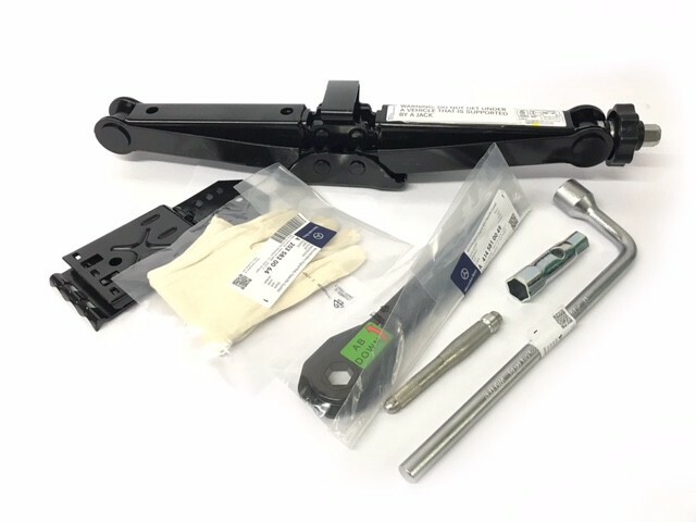 Комплект бортового инструмента: черный чехол с логотипом со следующим инструментом: домкрат, ключ для крепления колес, центрирующий штифт, противооткатный башмак, подкладная пластина, перчатки.