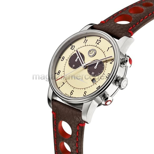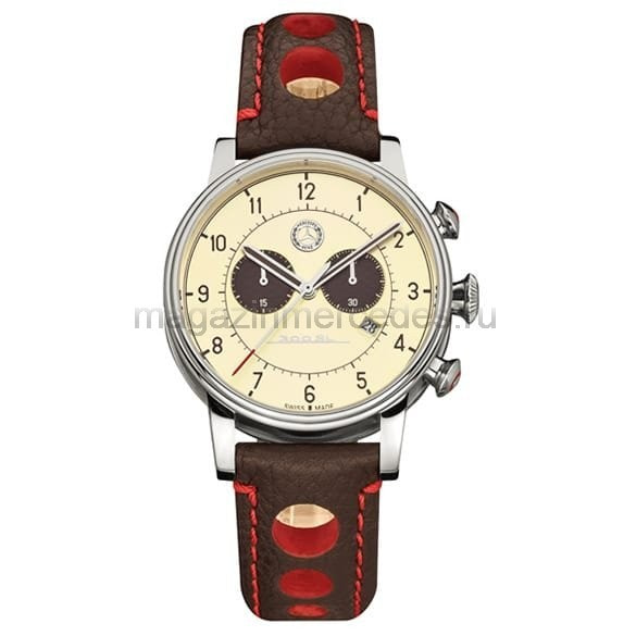 Мужской хронограф в стиле классического автомобиля 300 SL является одновременно практичным и модным аксессуаром. Классические спортивные часы имеют корпус из нержавеющей стали с красной отделкой на передней стороне кнопки. Гармоничный дизайн дополняет циферблат в цвете бежевого металла с красной и коричневой отделкой, рельефный рисунок в виде волн в окнах счетчиков, эмблема 300 SL, а также стрелки в цвете стали. Удобный коричневый браслет изготовлен из телячьей кожи с красной отстрочкой и перфорацией в спортивном стиле. Часы имеют водонепроницаемые свойства до 10 атмосфер и практичную функцию остановки.