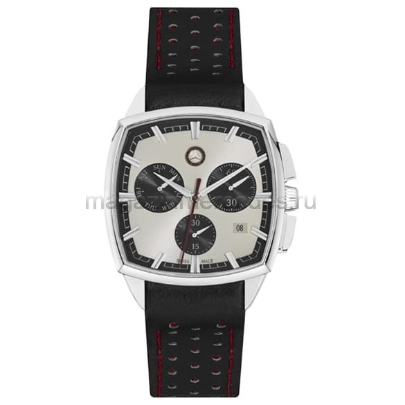 Мужские часы-хронограф Classic Rallye, выдержанные в черном, бежевом и бордовом цвете, имеют корпус квадратной формы из нержавеющей стали, демонстрируют элегантный спортивный дизайн и всегда показывают точное время. Благодаря просветленному с обеих сторон сапфировому стеклу циферблат, представляющий собой комбинацию черных и бежевых поверхностей, отлично виден. Бордовое обрамление циферблата стильно завершает дизайн. Историческая звезда «Мерседес-Бенц» расположена в положении «12 часов». Стрелки часов стального цвета имеют люминесцентное покрытие Super-LumiNova®, которое позволяет видеть время в темноте. Секундная стрелка выполнена в бордовом цвете. Дальнейшей яркой особенностью является ремешок из черной телячьей кожи с перфорацией и красной подкладкой, красной прострочкой и красной внутренней стороной. Часы-хронограф были разработаны согласно дизайнерской философии «Мерседес-Бенц». - Цвет: черный/бежевый/бордовый - Материал: нержавеющая сталь/телячья кожа - Размеры: 40 x 40 мм - Стрелки с люминесцентным покрытием Super-LumiNova® - Водонепроницаемые до 5 ATM - Кварцевый механизм Ronda Z60 - Сделано в Швейцарии