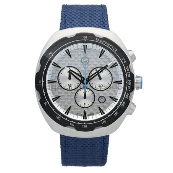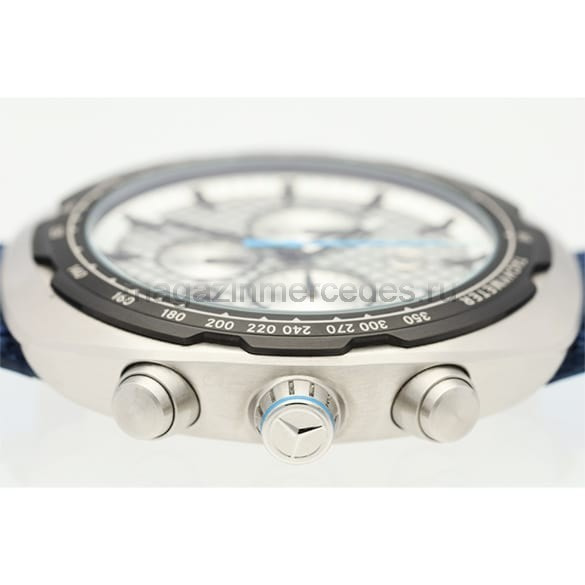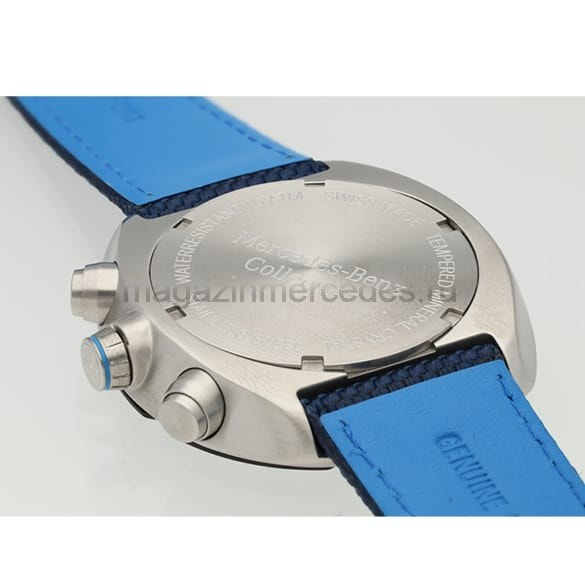 Будь то бизнес или отдых - всегда хорошее решение: мужской хронограф, созданный в стилистике «Мерседес-Бенц» в спортивном брутальном дизайне в серебристом, черном и синем цветах восхищает своим корпусом из нержавеющей стали с матовыми поверхностями. Для надежного удержания на запястье и высокого комфорта при ношении хронограф также снабжен синим кожаным ремешком с текстильной структурой сверху. В дополнение к функции секундомера мужской хронограф был также оснащен тахиметрической шкалой на черном люнете с ПВДХ-покрытием. Через минеральное стекло с антибликовым покрытием с двух сторон виден серебристый циферблат из настоящего карбона с метками стального цвета, который дополняется часовыми и минутными стрелками в том же стальном цвете. Кроме того, на циферблате изображена благородная звезда «Мерседес-Бенц» на уровне отметки 12 часов, а также индикатор даты на уровне 04:30 часов. Секундная стрелка и маленькие стрелки в маленьких циферблатах выполнены в контрастном синем цвете и гармонично дополняют дизайн хронографа.