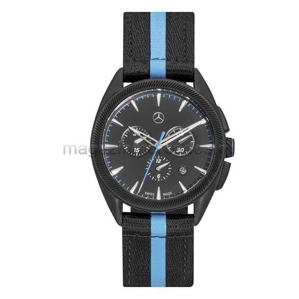 Мужские часы-хронограф Sport Fashion M3 черно-синего цвета с кварцевым механизмом Ronda 5030 всегда показывают точное время и покоряют модным спортивным дизайном. Часы имеют корпус из нержавеющей стали с покрытием PVD черного цвета и выпуклым, закаленным, просветленным с обеих сторон минеральным стеклом. Через него прекрасно виден черный циферблат с объемными метками часов с люминесцентным покрытием Super-LumiNova®. Циферблат украшен объемной звездой «Мерседес-Бенц», а часовая и минутная стрелки и синяя секундная стрелка также имеют люминесцентное покрытие. Благодаря этому время можно узнать и в темноте. Черный нейлоновый ремешок с синей полоской в центре обеспечивает высокий комфорт ношения. Мужские часы были разработаны согласно дизайнерской философии «Мерседес-Бенц». - Цвет: черный/синий - Материал: нержавеющая сталь/нейлон - Диаметр: 42 мм - Водонепроницаемые до 10 ATM - Кварцевый механизм Ronda 5030 - Сделано в Швейцарии