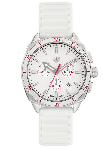 Всегда знать точное время: спортивные женские часы Sport Fashion позаботятся о вашей пунктуальности. Часы-хронограф покоряют своими эксклюзивными функциями. Белый циферблат с элементами кораллового цвета и звездой «Мерседес-Бенц» подчеркивает спортивный характер часов с корпусом из нержавеющей стали, а выпуклое минеральное стекло обеспечивает оптимальную защиту. Часовая и минутная стрелки серебристого цвета с белым фосфорным покрытием, а также светящиеся и полированные до блеска метки обеспечивают хорошую считываемость также и в темное время суток. Часы диаметром 42 мм украсят любую руку, а силиконовый ремешок белого цвета обеспечивает приятный комфорт при ношении. Водонепроницаемые до 20 ATM часы со швейцарским кварцевым механизмом Ronda 5030 и функцией хронографа имеют поворачивающийся в одну сторону люнет с 60-минутной шкалой.