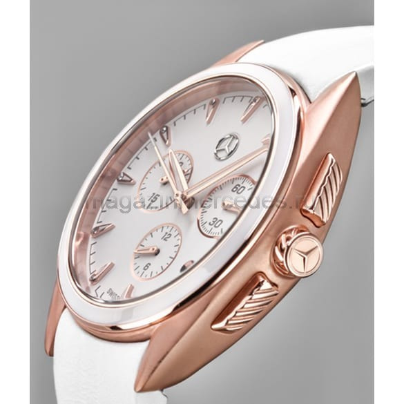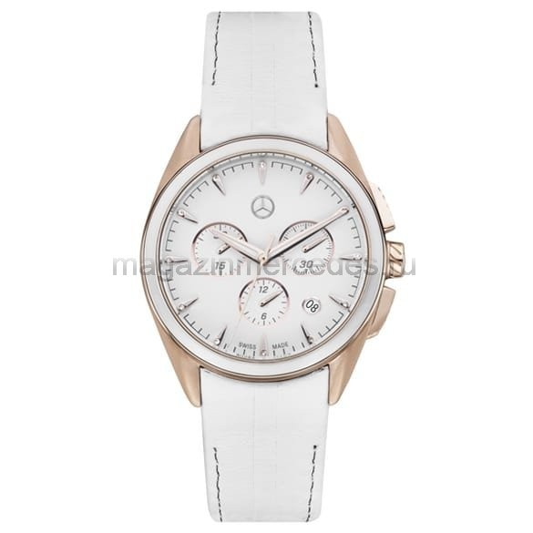 Спортивные и модные: дамские часы-хронограф Sport Fashion M3 с кварцевым механизмом Ronda 5030 всегда показывают точное время и покоряют привлекательными деталями. Корпус из нержавеющей стали с покрытием PVD в цвете «Розовое золото» и матированными, полированными поверхностями оснащен закаленным, просветленным с обеих сторон выпуклым минеральным стеклом. Это обеспечивает оптимальную видимость белого циферблата с накладками цвета «Розовое золото». Метки часов украшены кристаллами Swarovski® и имеют люминесцентное покрытие Super-LumiNova®. Светящееся покрытие имеют также стрелки цвета «Розовое золото», что позволяет видеть время в темноте. Кроме белого керамического люнета часы оснащены белым ремешком из телячьей кожи с классической застежкой, обеспечивающей оптимальный комфорт ношения. Дамские часы были разработаны согласно дизайнерской философии «Мерседес-Бенц». - Цвет: «Розовое золото»/белый - Материал: нержавеющая сталь/телячья кожа - Диаметр: 39 мм - Водонепроницаемые до 10 ATM - Кварцевый механизм Ronda 5030 - Сделано в Швейцарии