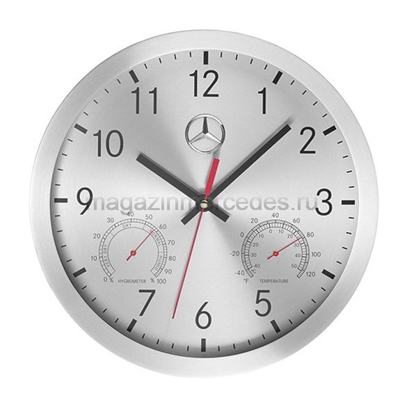 Корпус настенных часов и циферблат выполнены из алюминия. Поверхность циферблата дополнительно отшлифована. Шлифовка преломляет падающий свет, который в зависимости от отражения перемещается по кругу. Кроме того, настенные часы с кварцевым часовым механизмом и секундной стрелкой имеют функцию термометра и гигрометра.