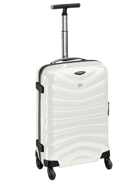 Чемодан Firelite Spinner. Материал: полипропилен (Curv). Эластичные перекрестные ремни в основном отделении, обтянутый тканью разделитель в крышке. Легкие и бесшумные колеса. 3-значный кодовый замок. Размер (подходит для перевозки в ручной клади): 40 x 55 x 20 см. Вес: 1,95 кг. Производитель: Samsonite для «Мерседес-Бенц».
