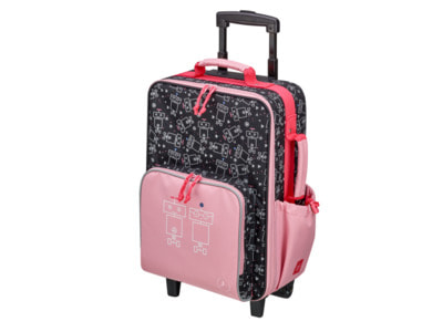 Собираем чемоданы! С черно-розовым чемоданом на колесиках для маленьких путешественниц отпуск может начинаться. В чемодан из водоотталкивающего внешнего материала с большим основным отделением можно удобно сложить одежду и прочие вещи и зафиксировать их с помощью двух ремней, чтобы все оставалось на своем месте. Дополнительно имеется отделение на застежке-молнии впереди и боковой наружный карман. Практичный чехол для обуви и небольшая прозрачная вставка для таблички с именем завершают дизайн. Чтобы с чемоданом мог легко управиться ребенок, он оснащен удобной выдвижной двухступенчатой ручкой. Внешний вид чемодана ни в чем не уступает его функциональности. Кроме вышитой тон в тон звезды «Мерседес-Бенц» впереди и подкладки, а также чехла для обуви с логотипом «Мерседес-Бенц», имеется приятный сюрприз. Дизайнерский эффект «Glow in the Dark» заставляет светиться изображения роботов «Мерседес-Бенц» в темноте. Так любая поездка станет сплошным удовольствием! - Цвет: черный/розовый - Материал: полиэстер - Размеры: прибл. 29,5 x 19,5 x 46 см - Водоотталкивающий материал - Основное отделение с двумя ремнями - Чехол для обуви - Светящийся эффект - Производитель: Lässig для «Мерседес-Бенц»