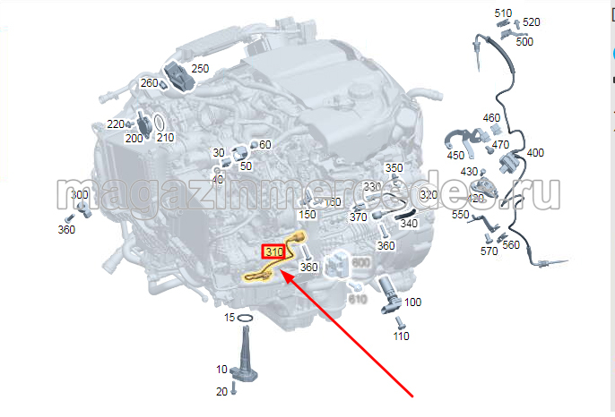 Датчик детонации на левой передней стороне блока цилиндров двигателя Mercedes SL Class R232