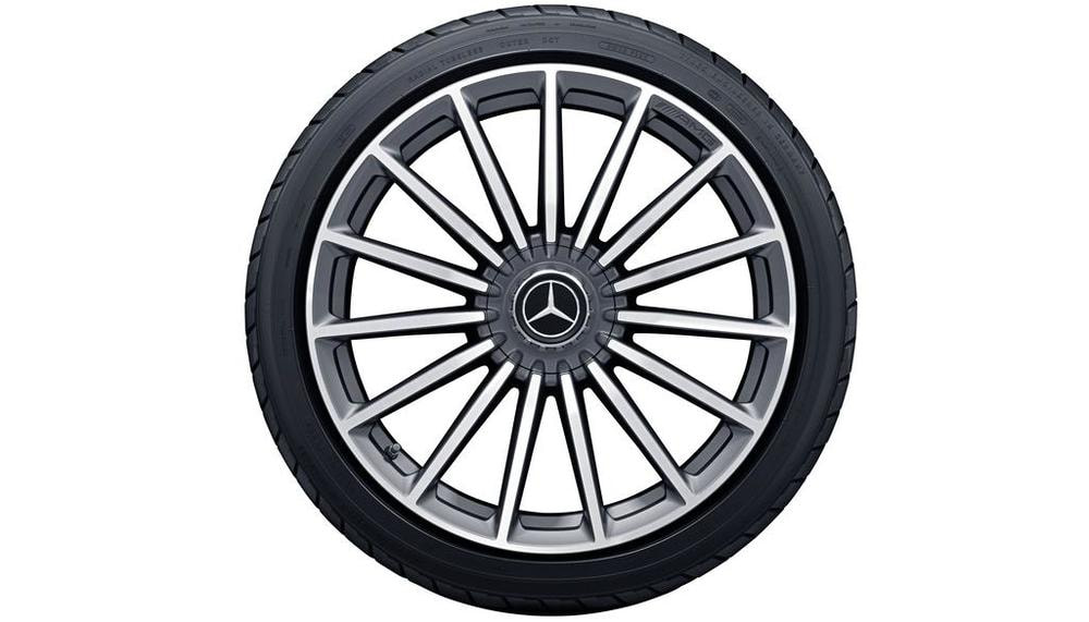 Колесный диск AMG с 5 спицами. Параметры диска:9,5 J x 20 ET 25,1 (20 дюймов). Цвет: Серый титан. Материал: Алюминий. Рекомендуемая резина: 265/40 R20. Мост: Передний мост.