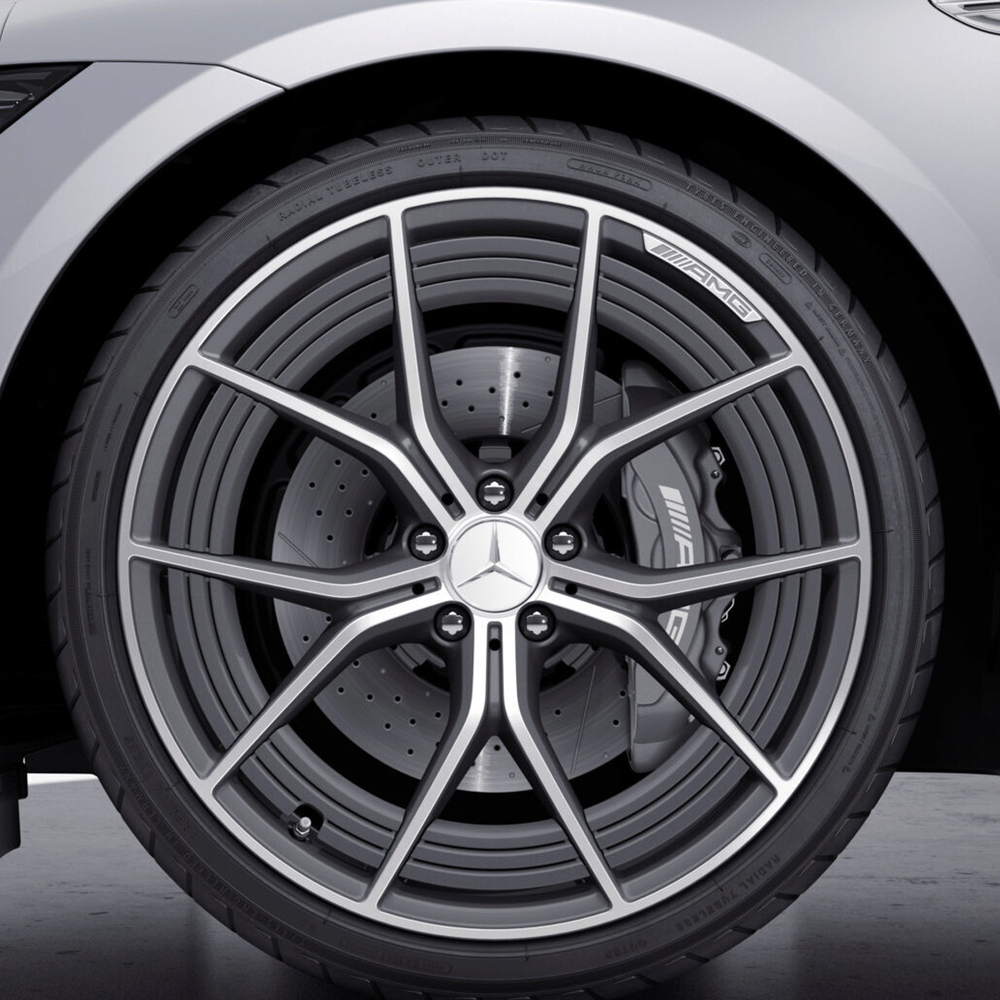 Колесный диск AMG с крестообразными спицами. Параметры диска:11,5 лет x 21 ET 30 (21 дюймов). Цвет: Серый тантал. Материал: Алюминий. Рекомендуемая резина: 315/30 R21. Мост: Задний мост.