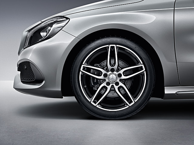 Колесный диск AMG с 5 сдвоенными спицами. Параметры диска: 7,5 J x 18 ET 52 (18 дюймов). Цвет: черный. Материал: Алюминий. Рекомендуемая резина: 225/40 R18. Мост: Передний - Задний мост.