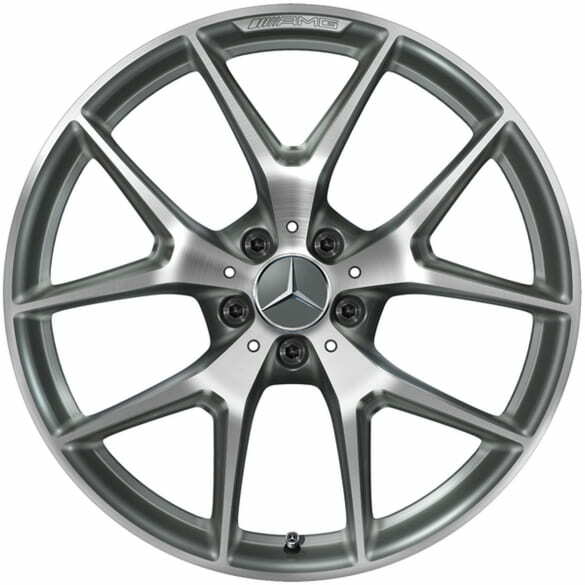 Колесный диск AMG с крестообразными спицами. Параметры диска: 8.5 J x 20 ET 40 (20 дюймов). Цвет: Серый титан Материал: Алюминий. Рекомендуемая резина: 255/45 R20. Мост: Предний мост мост.