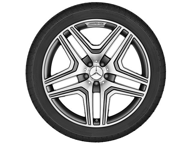 Диск AMG с 5 двойными спицами. Параметры диска: 10 J x 21 ET 46 (21 дюймов). Цвет: Серый титан. Материал: Алюминий. Рекомендуемая резина: 295/40 R21. Мост: Передний-Задний мост.