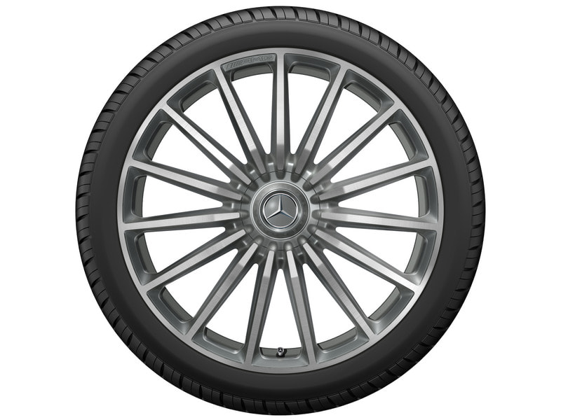 Диск AMG многоспицевый. Параметры диска: 11.5 J x 22 ET 47 (22 дюймов). Цвет: Серый Титан. Материал: Алюминий. Рекомендуемая резина: 325/40 R22. Мост: Задний мост.