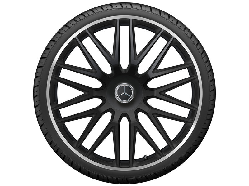 Диск AMG многоспицевый кованый. Параметры диска: 11.5 J x 23 ET 47 (23 дюймов). Цвет: Черный матовый. Материал: Алюминий. Рекомендуемая резина: 325/35 R23. Мост: Задний мост.