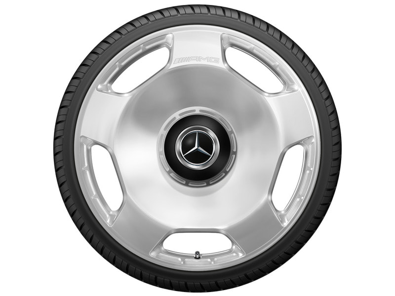 Диск AMG с 5 отверстиями кованый. Параметры диска: 11.5 J x 23 ET 47 (23 дюймов). Цвет: Серебристый. Материал: Алюминий. Рекомендуемая резина: 325/35R23. Мост: Задний мост.