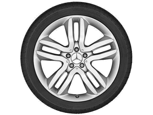 Колесный диск "МБ" с 5 двойными спицами. Параметры диска: 8,5 J x 20 ET 62 (20 дюймов). Цвет: Серебристый титан. Материал: Алюминий. Рекомендуемая резина: 275/50 R20. Мост: Передний-Задний мост.