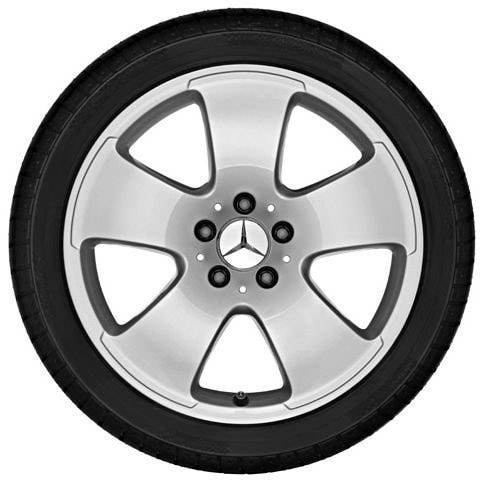Колесный диск "МБ" с 5 спицами. Параметры диска: 8.5 J x 18 ET 43 (18 дюймов). Цвет:Стерлинговое серебро. Материал:Алюминий. Рекомендуемая резина: 255/45 R18. Мост:Передний-Задний мост.