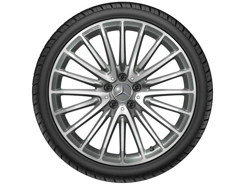 Колесный диск AMG многоспицевый. Параметры диска: 8 J x 20 ET 10 (20 дюймов). Цвет: Серый титан. Материал: Алюминий. Рекомендуемая резина: 245/35 R20. Мост: Передний мост.