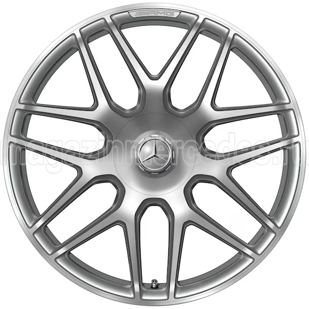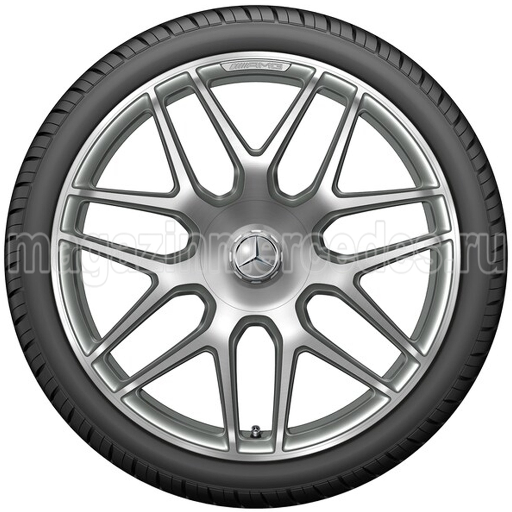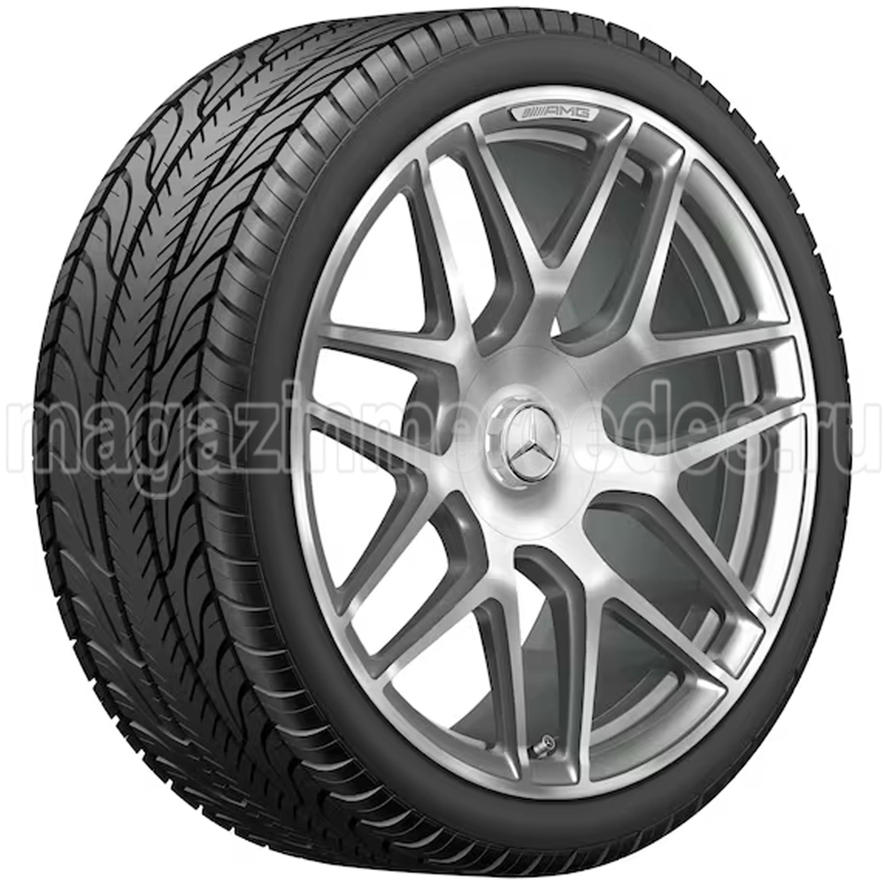 Колесный диск AMG с крестообразными спицами. Параметры диска: 10J x 22 ET 36 (22 дюймов). Цвет: Серый Титан. Рекомендуемая резина: 295/40 R22. Мост: Передний-Задний мост.