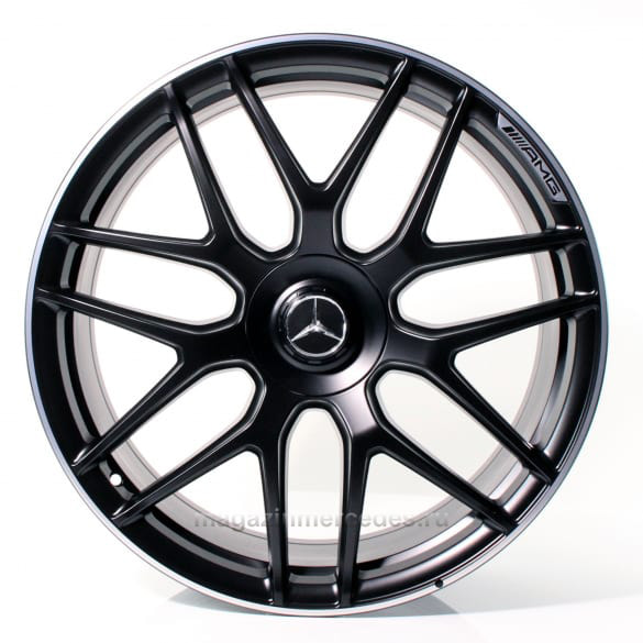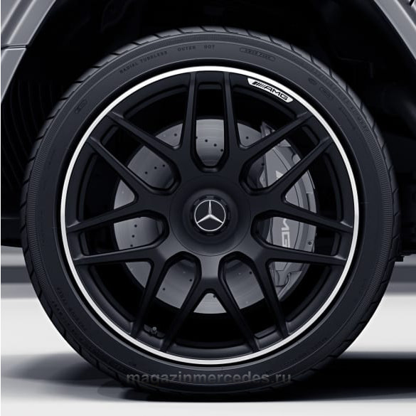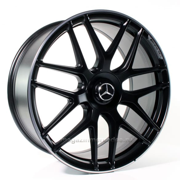 Колесный диск AMG с крестообразными спицами. Параметры диска: 10J x 22 ET 36 (22 дюймов). Цвет: Черный матовый. Рекомендуемая резина: 295/40 R22. Мост: Передний-Задний мост.
