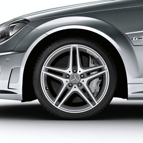 Колесный диск AMG с 5 двойными спицами. Параметры диска: 8 J x 18 ET 45 (18 дюймов). Цвет: Серый титан. Материал: Алюминий. Рекомендуемая резина: 235/40 R18. Мост: Передний-Задний мост.