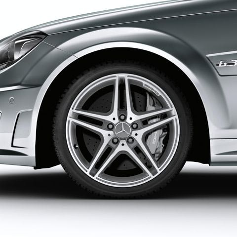 Колесный диск AMG с 5 двойными спицами. Параметры диска: 9 J x 18 ET 54 (18 дюймов). Цвет: Серый титан. Материал: Алюминий. Рекомендуемая резина: 255/35 R18. Мост: Задний мост.