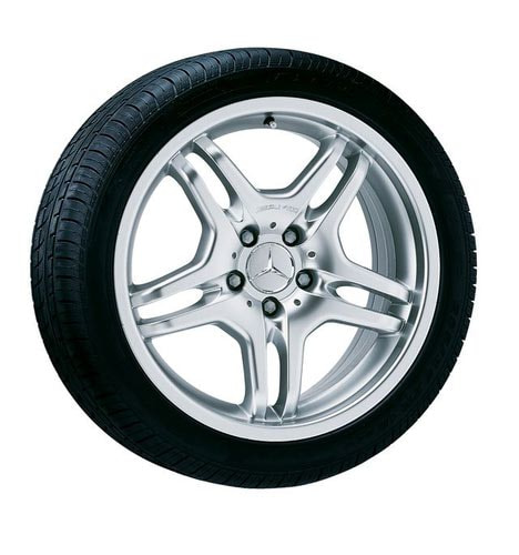 Колесный диск AMG с 5 двойными спицами. Параметры диска: 9,5 J x 18 ET 33 (18 дюймов). Цвет: Серебристый титан. Материал: Алюминий. Рекомендуемая резина: 265/35 R18. Мост: Задний мост.