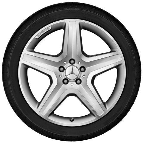Колесный диск AMG с 5 спицами. Параметры диска: 9 J x 20 ET 57 (20 дюймов). Цвет: Серебристый. Рекомендуемая резина: 265/45 R20. Мост: Передний-Задний мост.