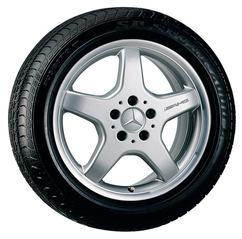 Колесный диск AMG с 5 спицами. Параметры диска: 7,5 J x 17 ET 37 (17 дюймов). Цвет: Стерлинговое серебро. Рекомендуемая резина: 225/45 R17. Мост: Передний-Задний мост.