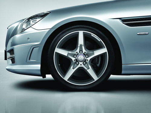 Колесный диск AMG с 5 спицами. Параметры диска: 8 J x 18 ET 36 (18 дюймов). Цвет: Серый титан. Рекомендуемая резина: 245/35 R18. Мост: Задний мост.