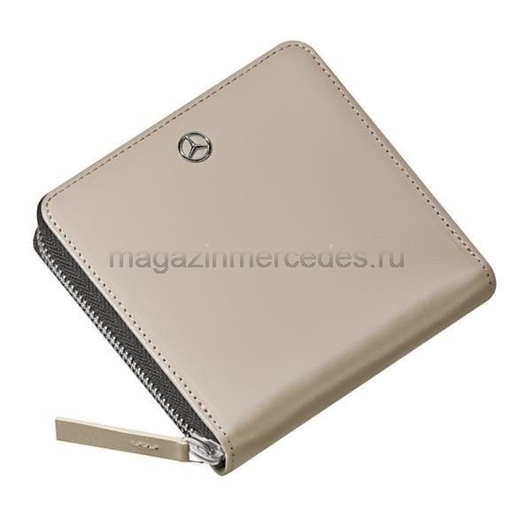 Здесь для всего найдется свое место: в оснащенном отделениями для банкнот, монет и карточек женском кошельке из гладкой яловичной кожи можно надежно хранить деньги, карточки и тому подобное. Серебристая металлическая застежка-молния по периметру повышает безопасность и предотвращает потерю вещей. Дизайн кошелька покоряет серо-бежевым цветом и серебристой заклепкой со звездой «Мерседес-Бенц». - Цвет: серо-бежевый - Материал: яловичная кожа - Размеры: прибл. 11 x 11 см - Различные отделения для банкнот, монет и карт - На молнии