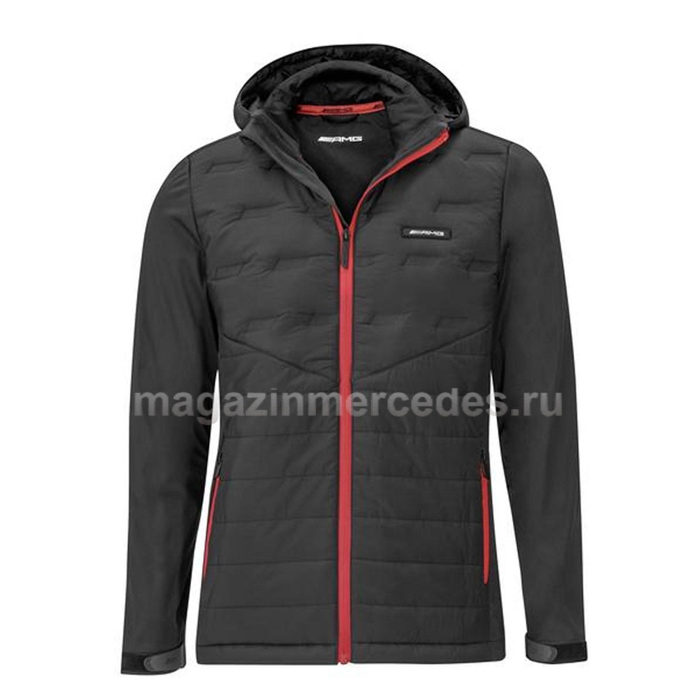 Куртка AMG hybrid для любой погоды: сочетает в себе биэластичный софтшелл и мини-рипстоп для защиты от ветра и холода. Съемный стеганый капюшон, приталенный крой. Низ завязывается шнурком, манжеты регулируются на липучке. Черный пластиковый значок с белым 3D-логотипом AMG в качестве акцента.