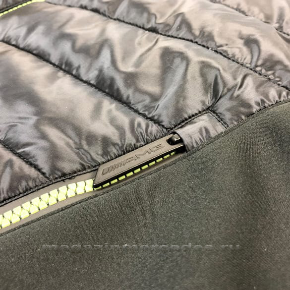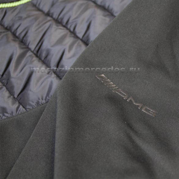 Гибридная мужская куртка AMG черно-зеленого цвета спортивного дизайна станет оптимальным спутником в любое время года. Верхний материал из 100 % полиэстера и утеплитель PrimaLoft® создают высокий комфорт ношения, а капюшон с подкладкой и внутренней стежкой позволяет носить ее и в холодную погоду. Спортивная гибридная куртка оснащена молнией с карбоновым тиснением и зелеными зубцами, а также высоким воротником для надежной защиты от ветра и холода. Удлиненный сзади нижний край округлой формы со шнурком и фиксаторами способствует оптимальной посадке куртки покроя Slim Fit. Ширину рукавов можно индивидуально регулировать с помощью пластиковых фиксаторов с эффектом карбона и незасоряющейся застежки-липучки. В практичных прорезных карманах на черно-зеленой молнии удобно носить мелкие предметы, например смартфон или ключи. Стежка тон в тон впереди и сзади и черный объемный принт логотипа AMG на левом рукаве придают куртке спортивный характер и в комбинации с черным металлическим бегунком молнии с рельефным логотипом AMG и зеленой тесьмой с черным логотипом AMG сзади на вороте гармонично завершают модный дизайн. - Цвет: черный/зеленый - Материал: нейлон, полиэстер/PrimaLoft® - Размеры: S–XXL - Легкий вес - Slim Fit