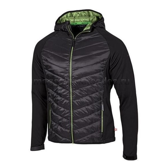 Гибридная мужская куртка AMG черно-зеленого цвета спортивного дизайна станет оптимальным спутником в любое время года. Верхний материал из 100 % полиэстера и утеплитель PrimaLoft® создают высокий комфорт ношения, а капюшон с подкладкой и внутренней стежкой позволяет носить ее и в холодную погоду. Спортивная гибридная куртка оснащена молнией с карбоновым тиснением и зелеными зубцами, а также высоким воротником для надежной защиты от ветра и холода. Удлиненный сзади нижний край округлой формы со шнурком и фиксаторами способствует оптимальной посадке куртки покроя Slim Fit. Ширину рукавов можно индивидуально регулировать с помощью пластиковых фиксаторов с эффектом карбона и незасоряющейся застежки-липучки. В практичных прорезных карманах на черно-зеленой молнии удобно носить мелкие предметы, например смартфон или ключи. Стежка тон в тон впереди и сзади и черный объемный принт логотипа AMG на левом рукаве придают куртке спортивный характер и в комбинации с черным металлическим бегунком молнии с рельефным логотипом AMG и зеленой тесьмой с черным логотипом AMG сзади на вороте гармонично завершают модный дизайн. - Цвет: черный/зеленый - Материал: нейлон, полиэстер/PrimaLoft® - Размеры: S–XXL - Легкий вес - Slim Fit