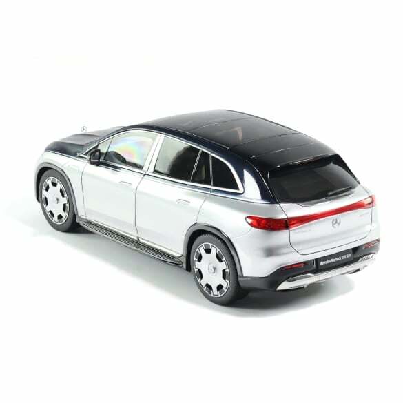 Оригинальная модель автомобиля Mercedes-Maybach 1:18 внедорожника EQS 680 Z296 впечатляет своей двухцветной окраской. Модель также имеет многочисленные особенности , такие как панорамный люк на крыше, подножки под алюминий с резиновыми шипами, ЦИФРОВОЕ ОСВЕЩЕНИЕ с функцией проекции и 21-дюймовые многоспицевые легкосплавные диски. В салоне холодильник в багажнике, Hyperscreen, Premium Rear, Rear Seat Entertainment и система объемного звучания Burmester® 4D завершают оснащение. Пять частей модели (двери и задняя дверь) можно открыть, чтобы обеспечить обзор салона автомобиля. Модель автомобиля, ограниченная 2000 штук, поставляется в упаковке Mercedes-Maybach, которая включает отвертку для легкого снятия и перчатку для защиты от отпечатков пальцев на остеклении или окрашенном кузове.