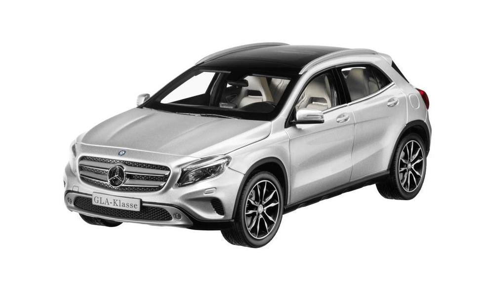 Модель GLA. Масштаб 1:18. Материал: цинковый сплав с деталями из пластмассы. Оригинальное лакокрасочное покрытие. Панорамная панель крыши, спортивные сиденья, АКП, фары ILS, рейлинги на крыше и двухцветные колесные диски размером 48,3 см (19") с 5 сдвоенными спицами. Точное воспроизведение деталей в соответствии с оригинальными данными CAD. Собранная вручную модель из более 110 отдельных деталей в точности имитирует оригинал. Точное воспроизведение всех деталей интерьера и высококачественное исполнение салона. Багажник, капот и двери открываются. Производитель: Norev для «Мерседес-Бенц».