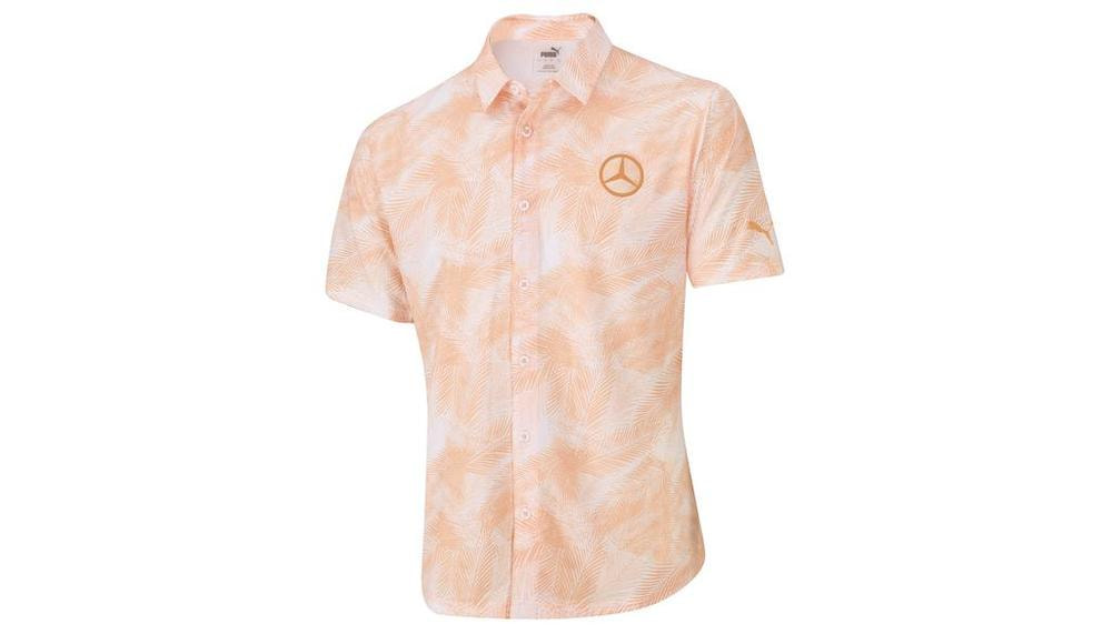 Mercedes на груди дополняет спортивный дизайн. Цвет: белый / оранжевый. Материал: 89% полиэстер / 11% эластан. Специальное издание для гольф-турнира чемпионов на Гавайях. Производство компании PUMA для коллекции Mercedes-Benz. S - B66450522, M - B66450523, L - B66450524, XL - B66450525, XXL - B66450526