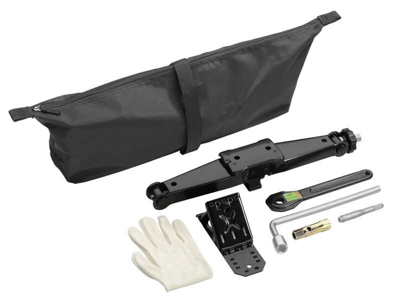 Комплект бортового инструмента: черный чехол с логотипом со следующим инструментом: домкрат, ключ для крепления колес, центрирующий штифт, противооткатный башмак, подкладная пластина, перчатки.