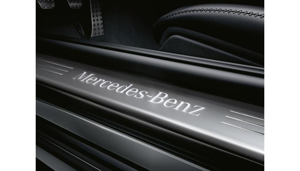 Данный инновационный элемент индивидуализации автомобиля не только является красивым аксессуаром, но и облегчает ориентирование в темноте: накладки порогов Mercedes-Benz (впереди) в качестве комплекта дооснащения со сменной планкой с белой светодиодной подсветкой. Съемные сменные планки повышают визуальную привлекательность зоны посадки и выхода.